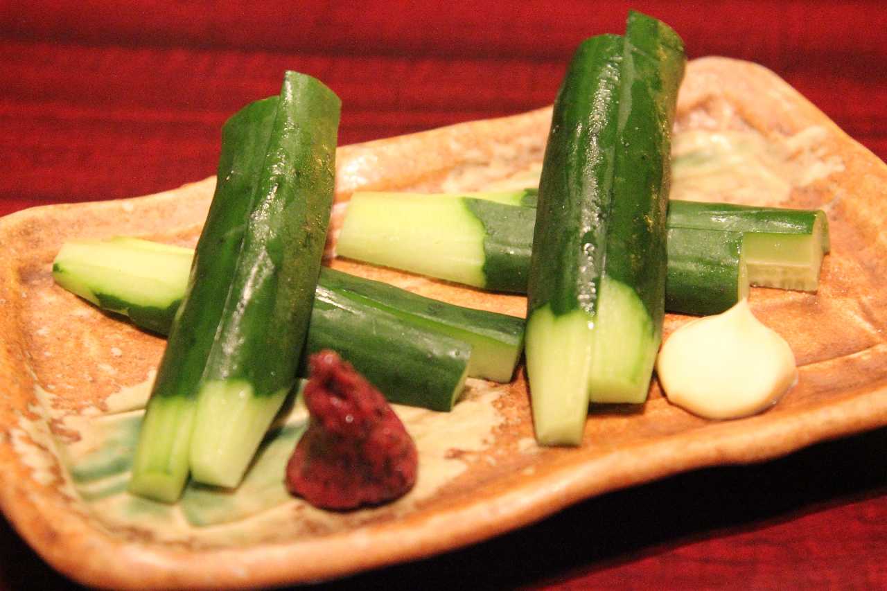 一口大に切ったきゅうりとを梅肉と調味料であえた料理。