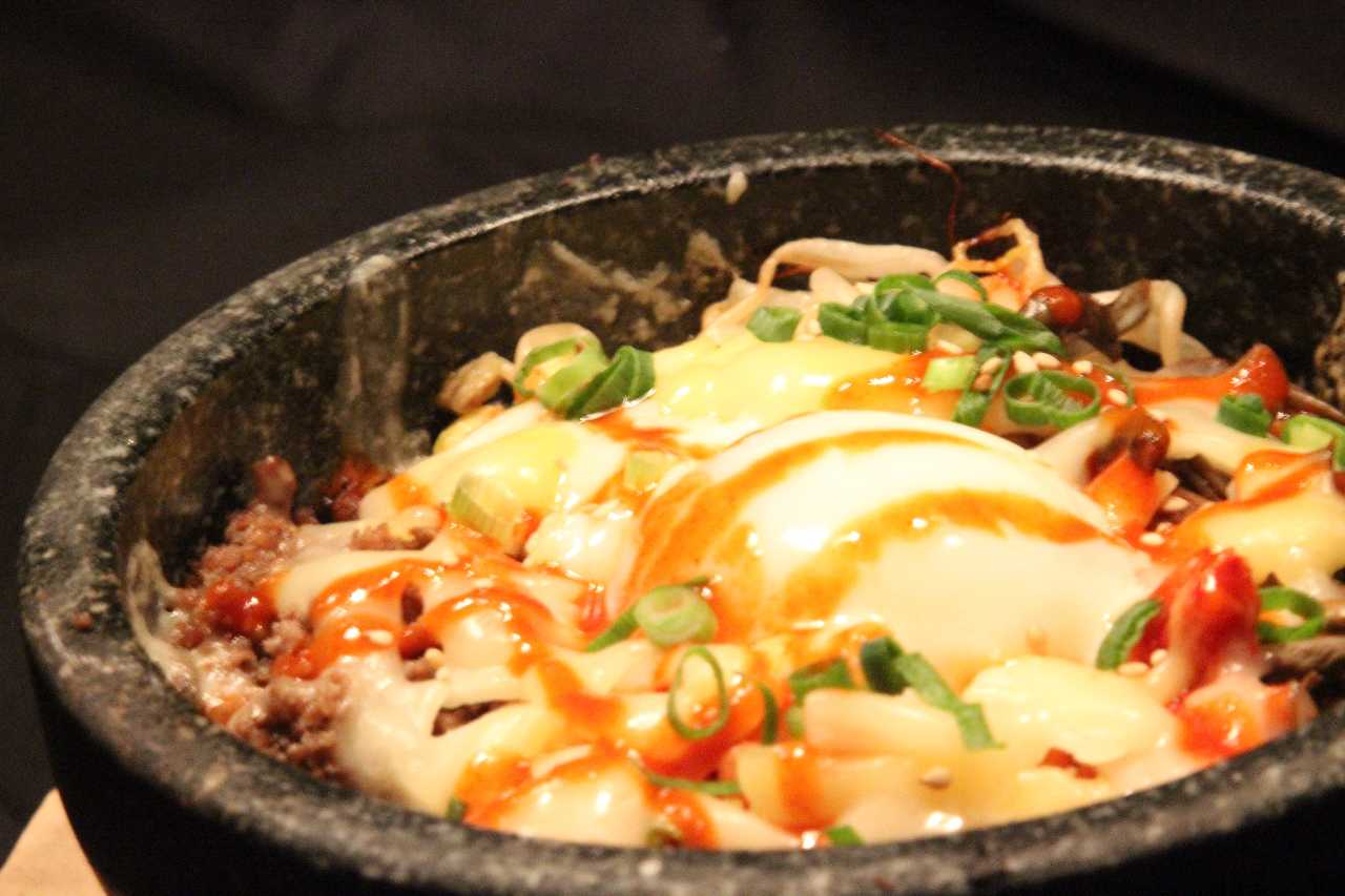 石焼鍋にご飯を入れて、数種類の具材とチーズをのせて熱した韓国料理。