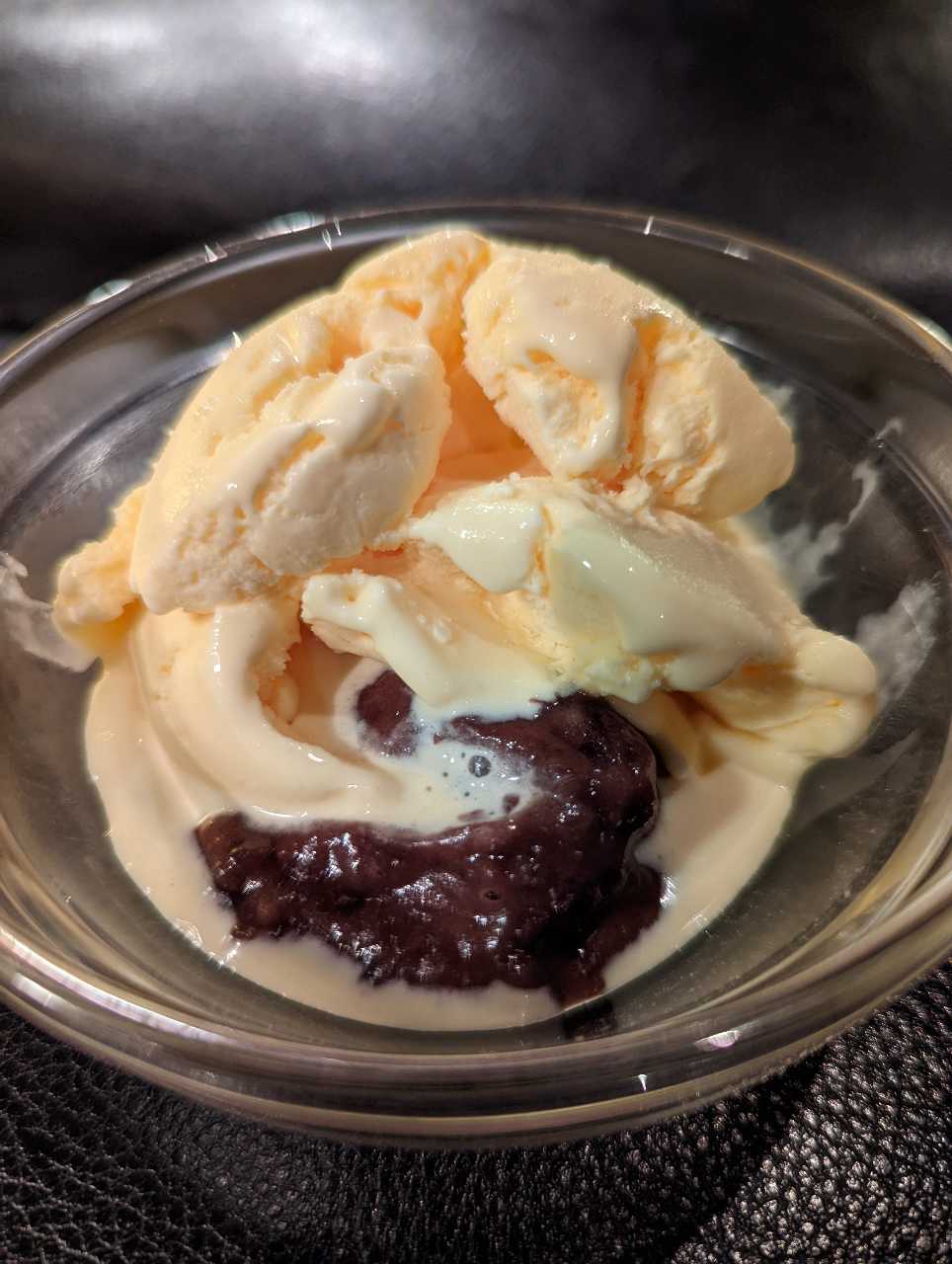 小麦粉とバター、チョコレートなどで作った生地を、型に入れて焼いたフランスのお菓子にバニラアイスクリームを添えた料理。