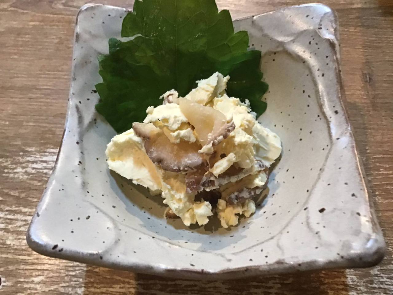 クリームチーズと、囲炉裏の上に吊るして燻した大根を米ぬかで漬け込んだ漬物料理。