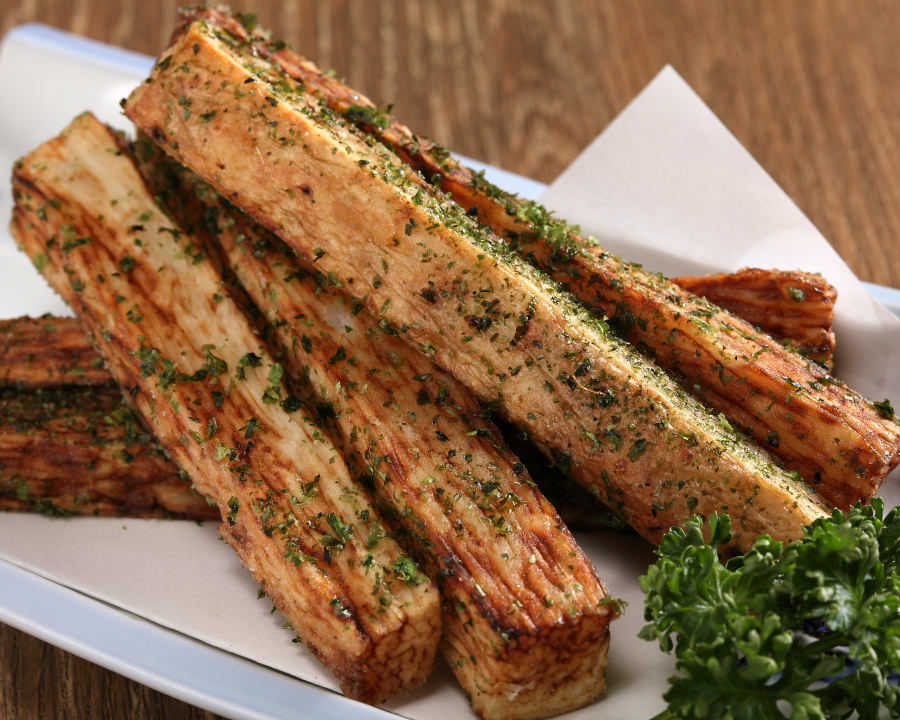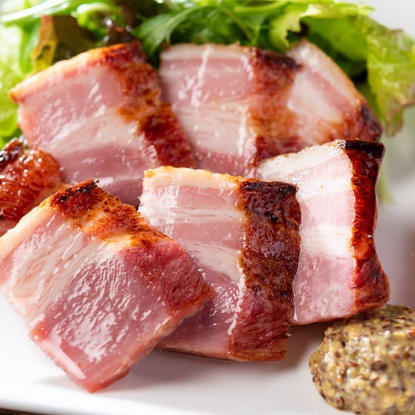 厚切りのベーコンを高温に熱した木材の時に出る煙に当てて風味付けした料理。