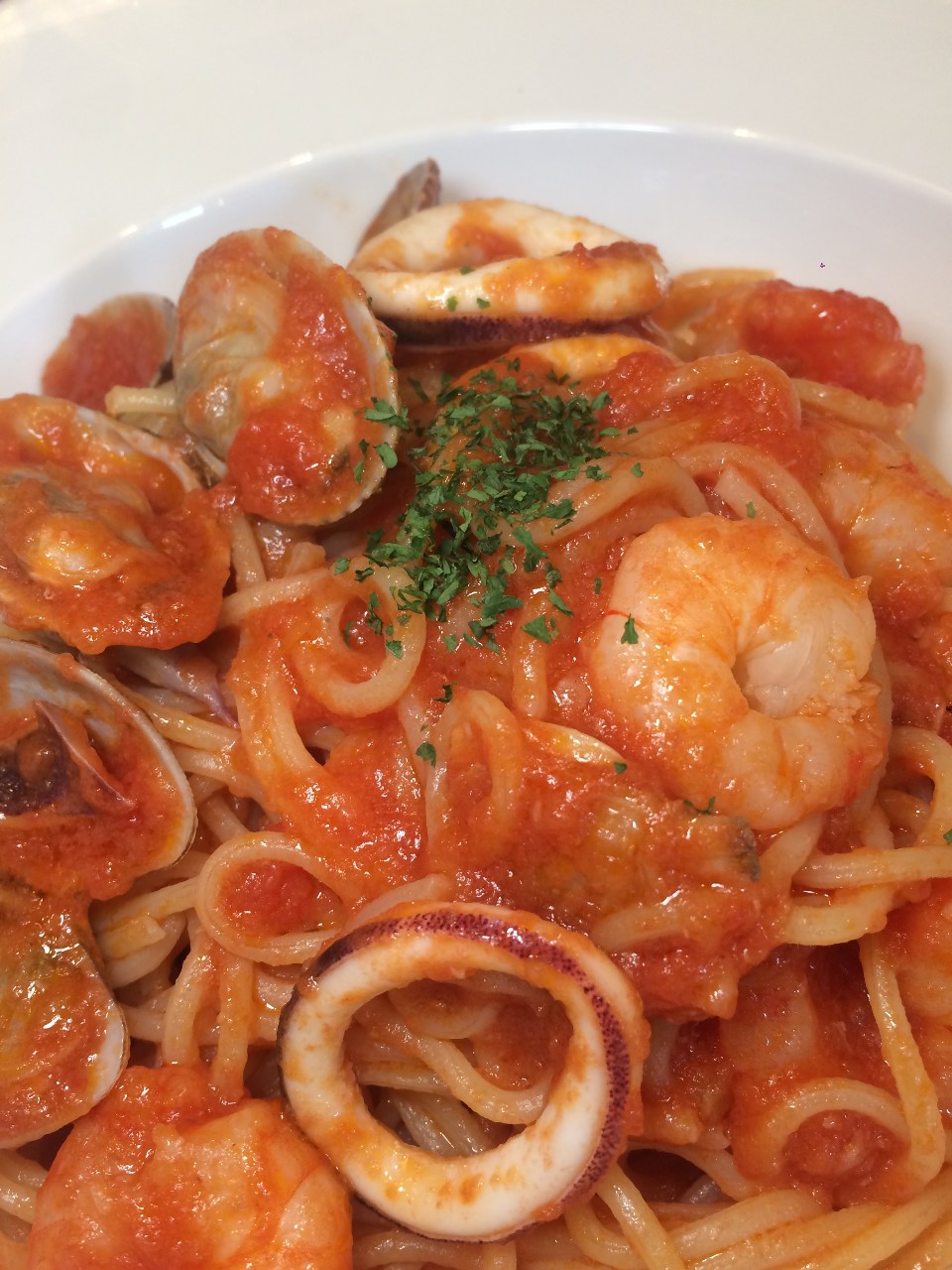 パスタに、海老や貝などの魚介類を煮込んでトマトソースをからめた料理。