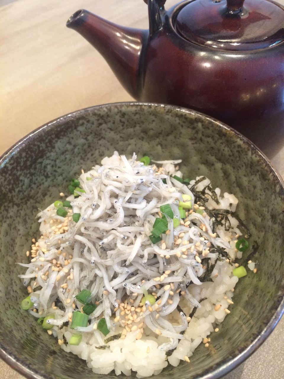 丼に盛ったご飯に、茹でたちりめんじゃこなどをのせた料理。
