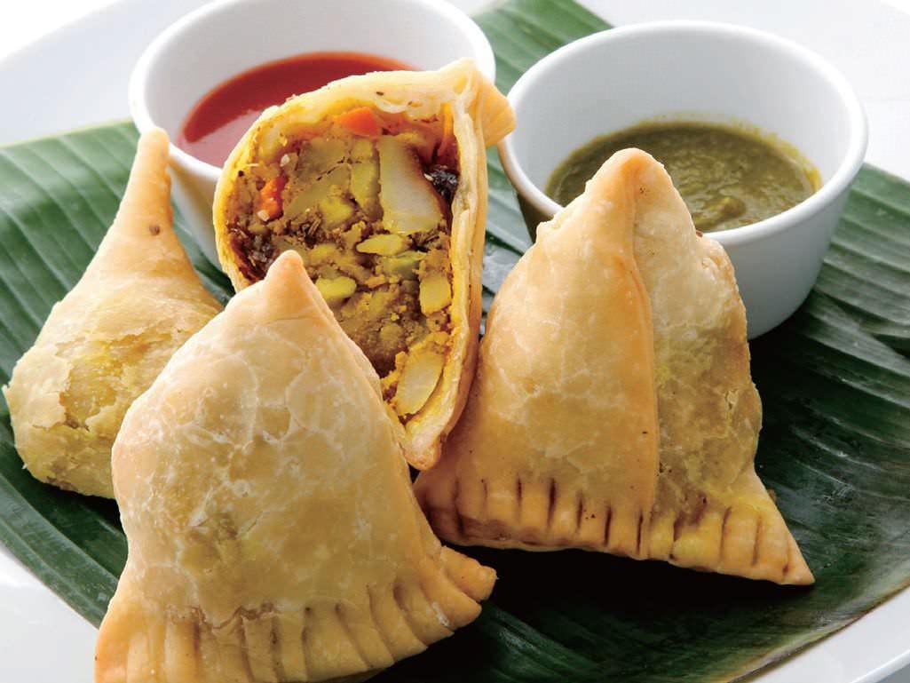 すり潰したじゃがいもと玉ねぎ、挽肉にインド特有の香辛料を混ぜて、小麦粉の皮で三角形に包んで油で揚げた料理。