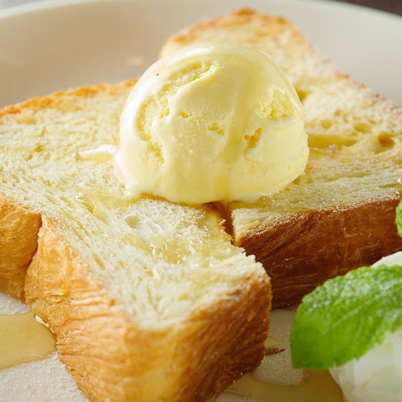 食パン丸々一斤に切れ込みを入れて焼き、蜂蜜をかけてアイスクリームやフルーツをのせた料理。