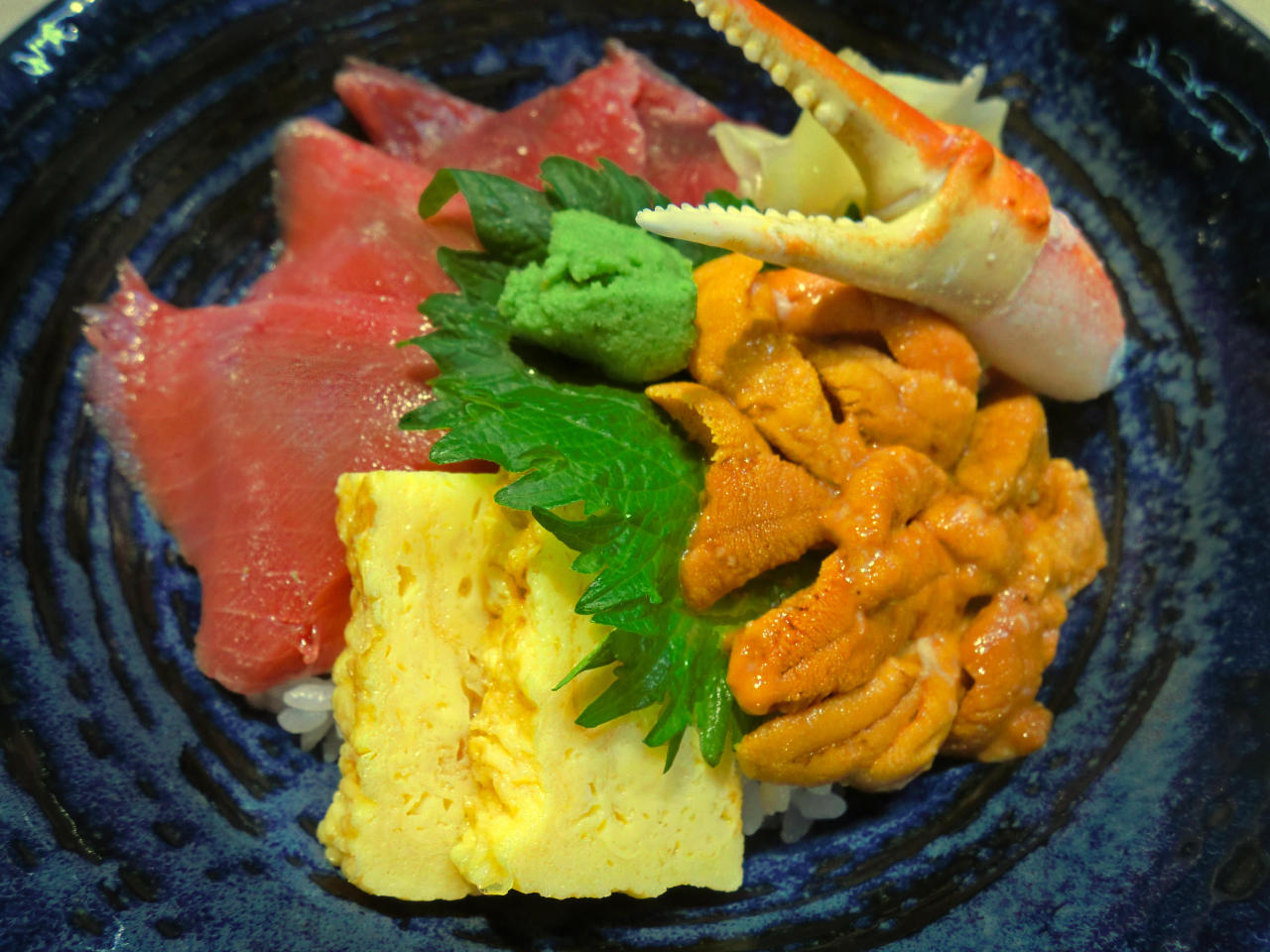 丼に盛ったご飯に、ズワイガニと9種類の魚介類をのせた料理。