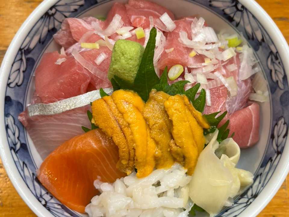丼に盛ったご飯に、マグロやサーモンとウニをのせた料理。