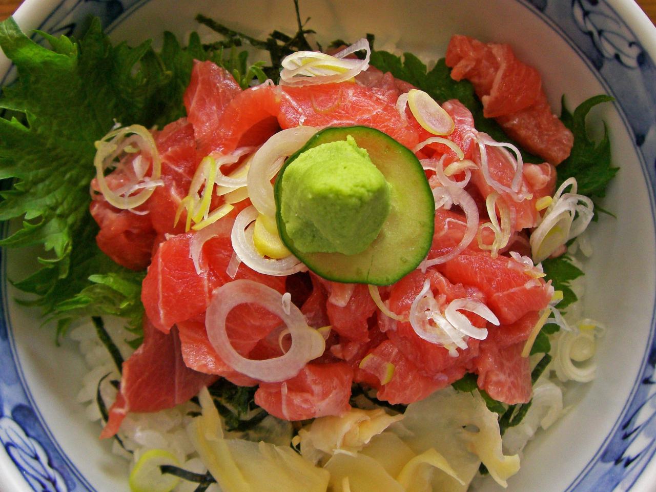 丼に盛ったご飯に、マグロの刺身とペースト状のマグロに刻んだネギを散らしたものをのせた料理。