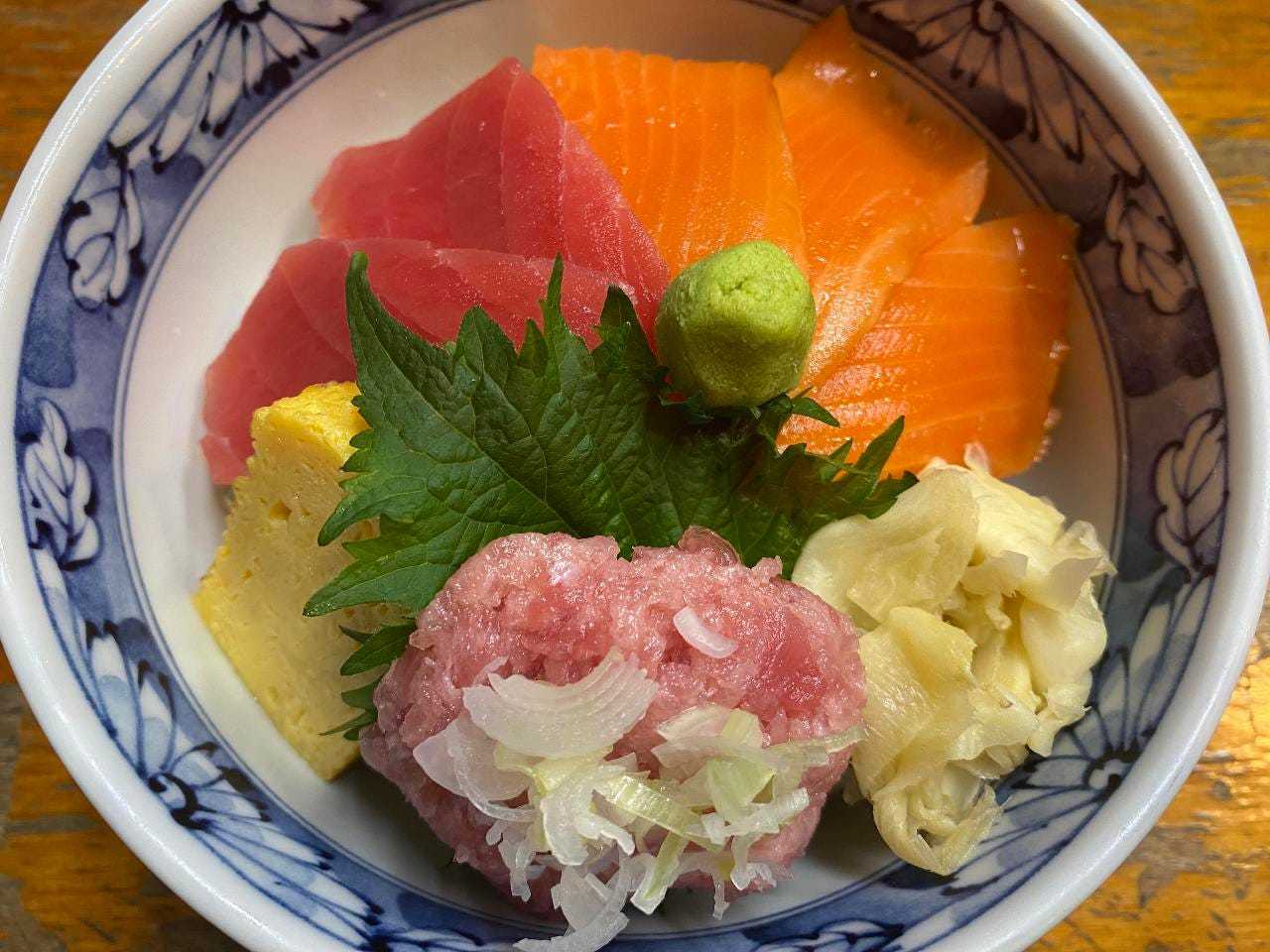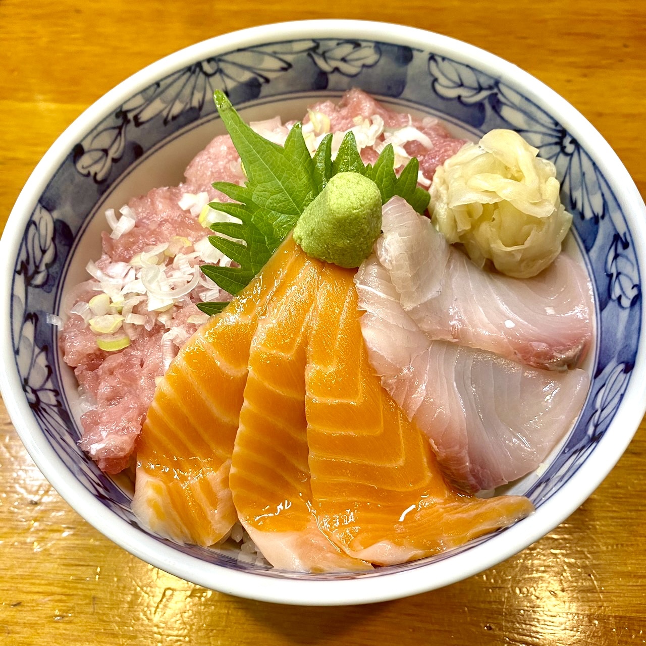 丼に盛ったご飯に、マグロとサーモンの刺身、ペースト状のマグロと刻んだネギをのせた料理。