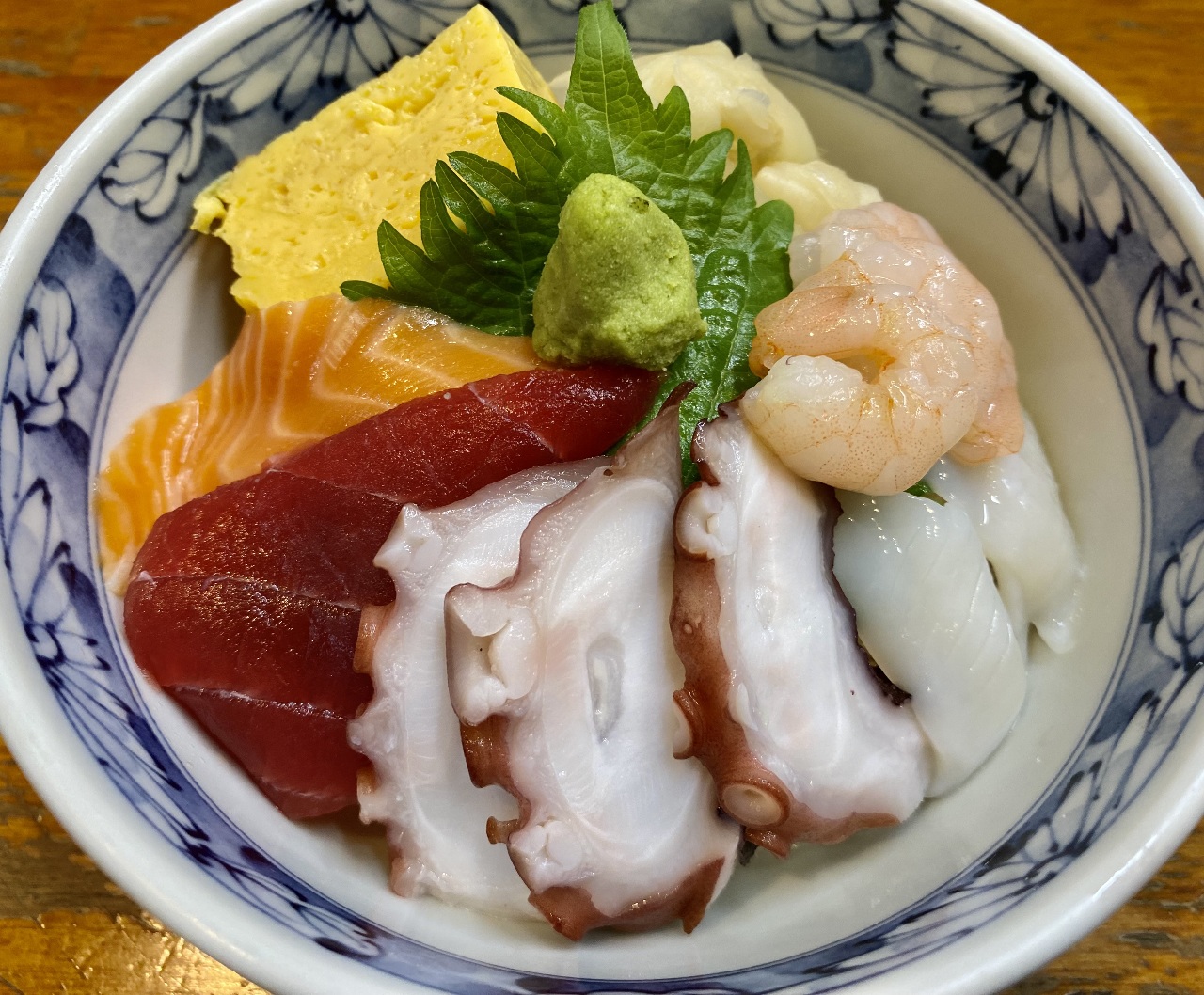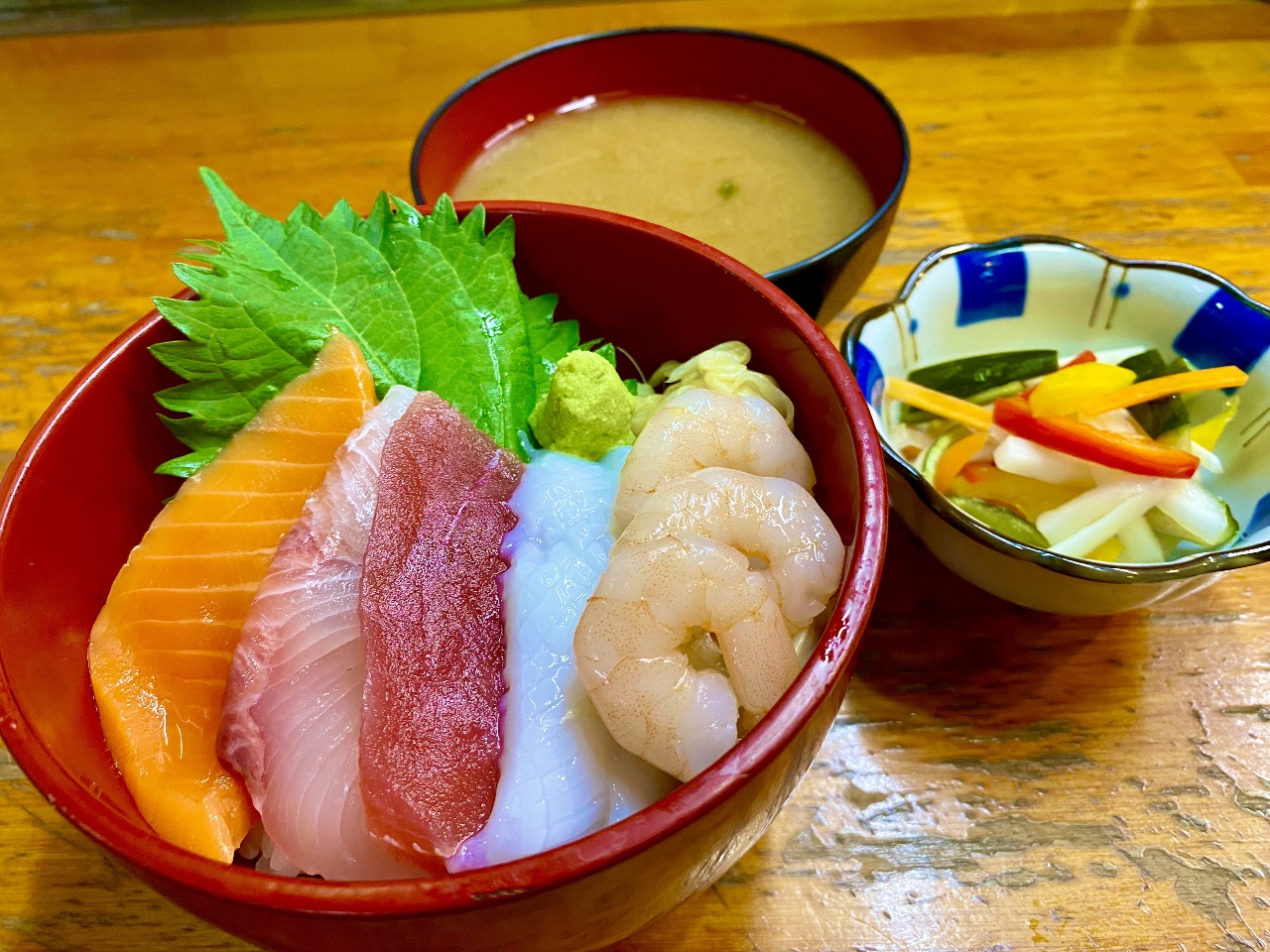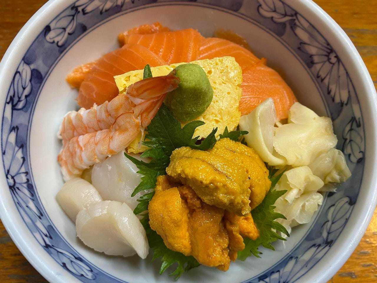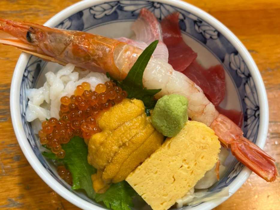 丼に盛ったご飯に、時期によって変わる魚介類をのせた料理。