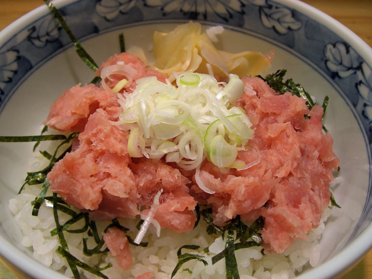 丼に盛ったご飯に、ペースト状のマグロに刻んだネギを散らした料理。