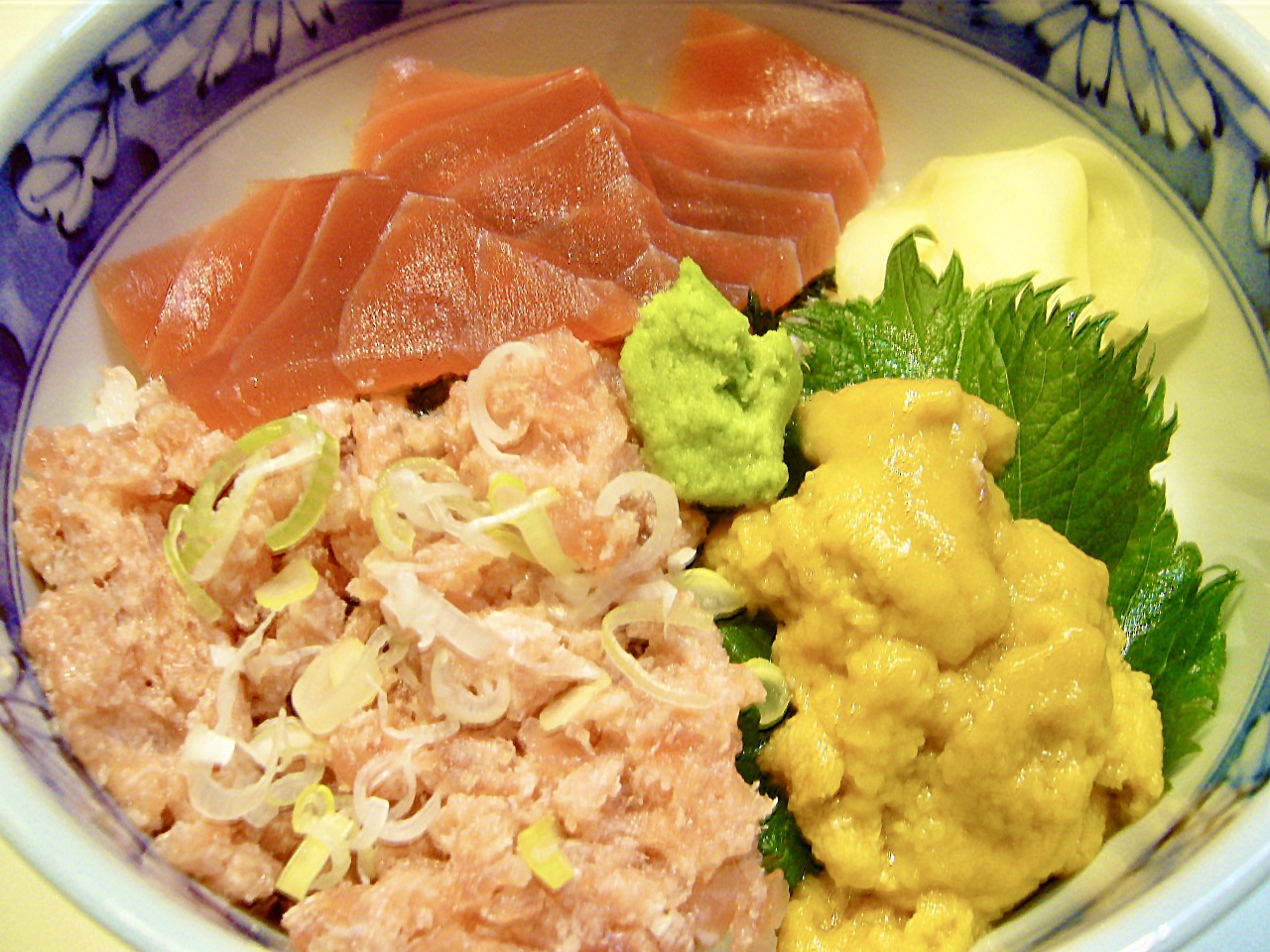 丼に盛ったご飯に、ペースト状のマグロと刻んだネギ、マグロとウニをのせた料理。