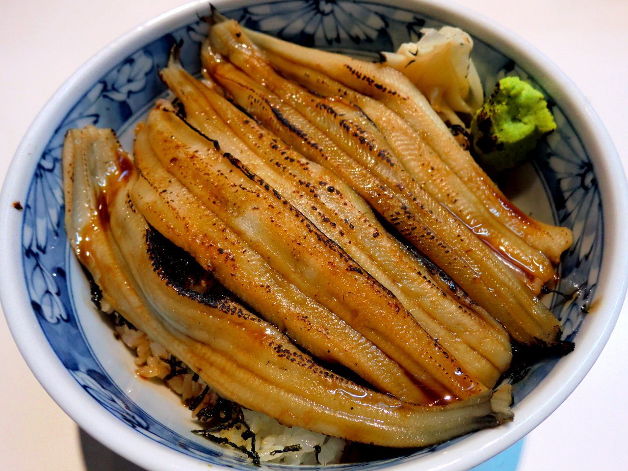 丼に盛ったご飯に、穴子やうなぎの若魚の蒲焼をのせた料理。