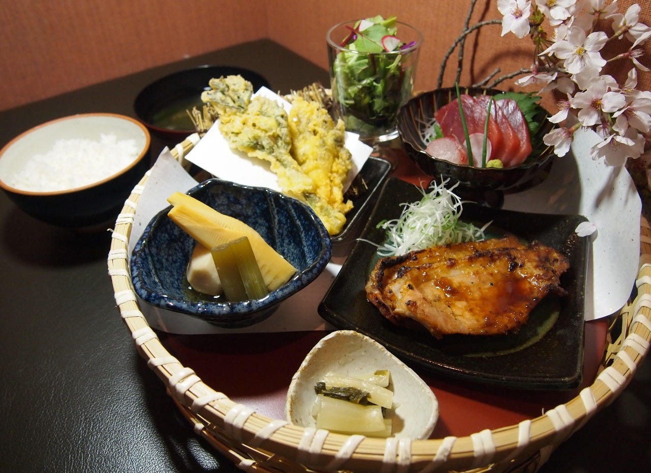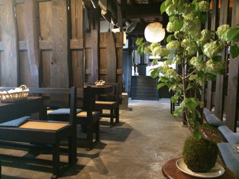 Enjoy a meal inside an elegant interior made with materials from an old sake cellar.