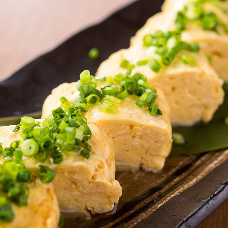 溶き卵にだし汁を混ぜて、厚めに巻きながら焼きあげる料理。