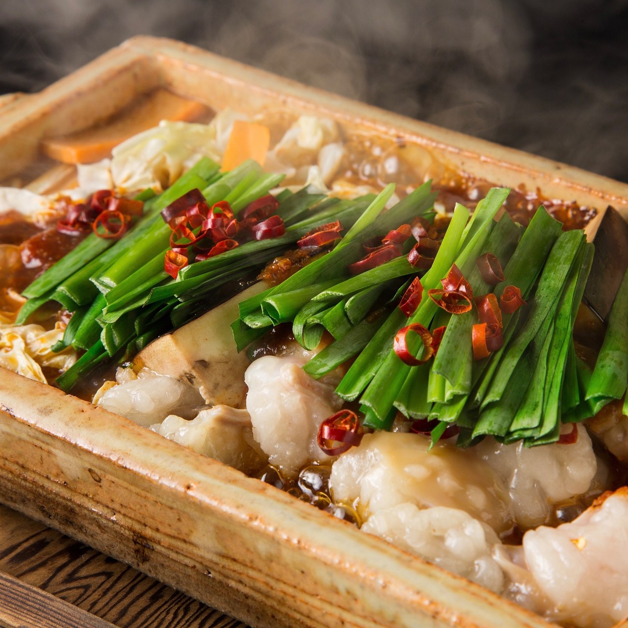 出汁に牛や豚のモツと野菜を入れ、一緒に鍋で煮込んだ料理。