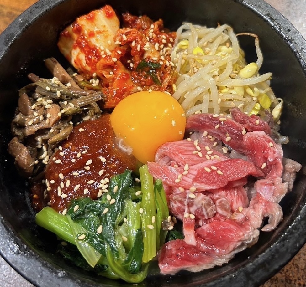 石焼鍋にご飯を入れて、ナムルと肉、コチュジャン、卵などをのせて熱した韓国料理。