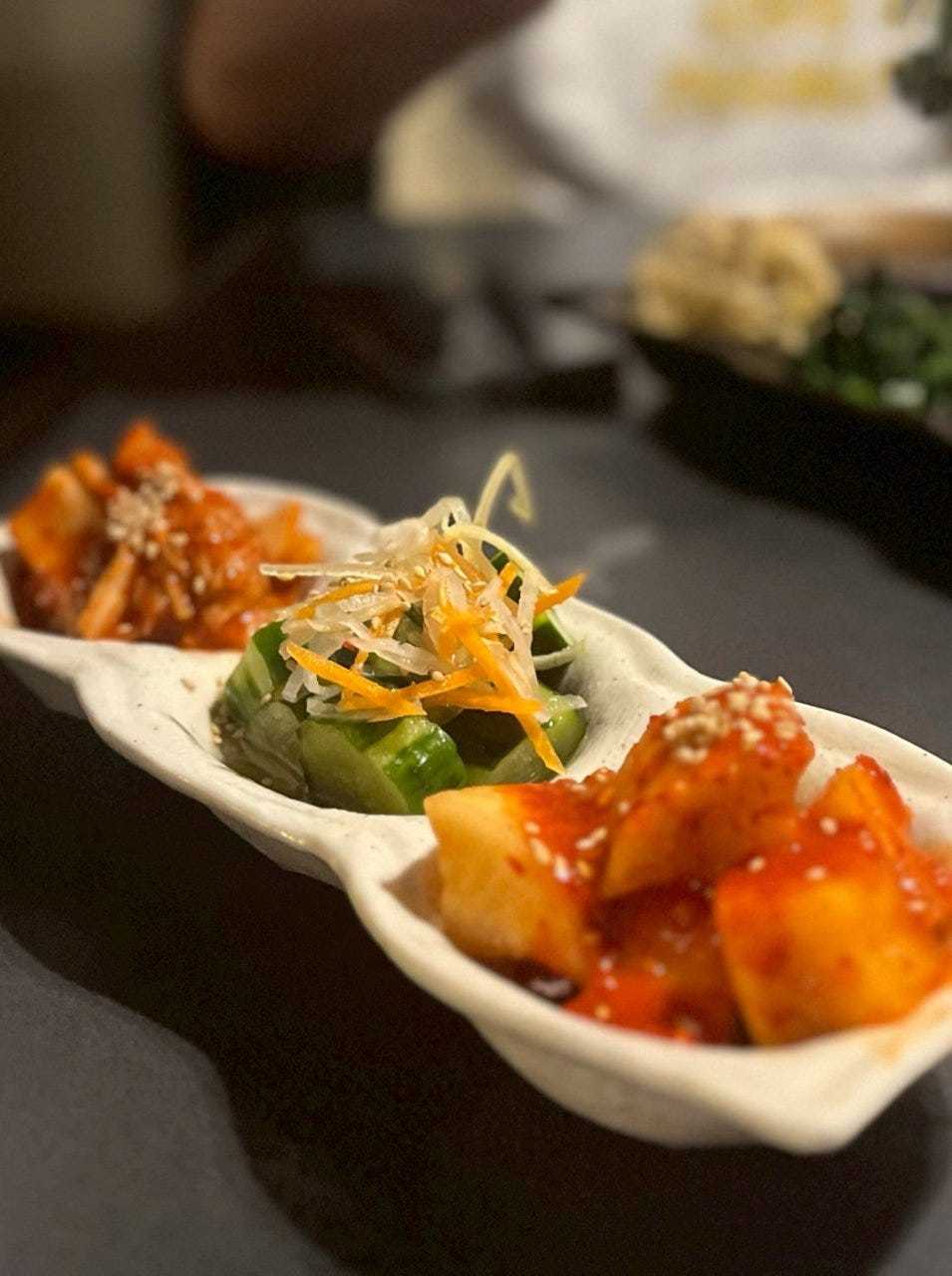 一口大の四角に切った大根をキムチに漬けた料理。