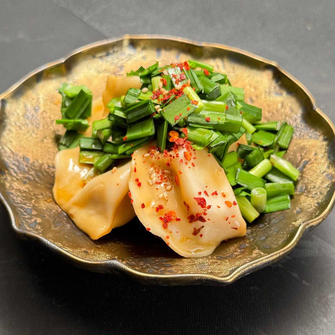 小麦粉の皮で、海老やニラなどの具を包み、茹でた料理。