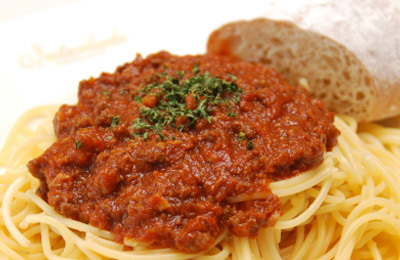 合いびき肉, トマト, たまねぎ, にんじん, にんにく, スパゲティ