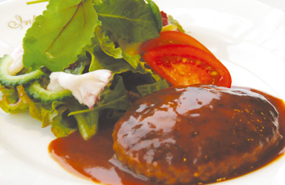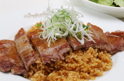 炒めた米に具を入れて一緒に出汁で炊いたものに、厚めに切って焼いた牛肉をのせた料理。