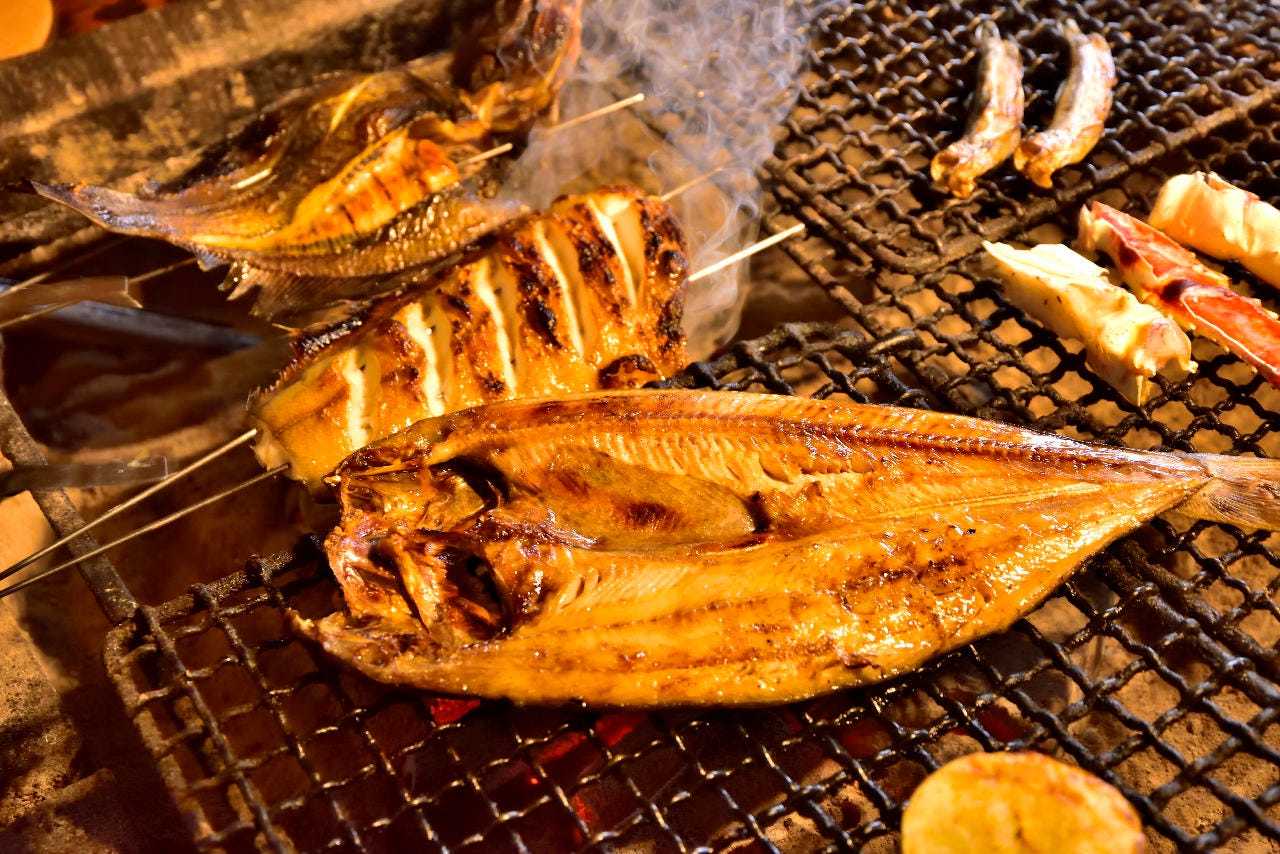 炉端焼盛り合わせ (ホッケ、シシャモ、じゃがバター、イカの塩辛 など)