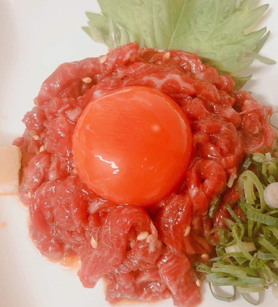 生の牛肉を細かく刻んで、数種類の薬味と調味料を和えて、卵黄をのせた料理。