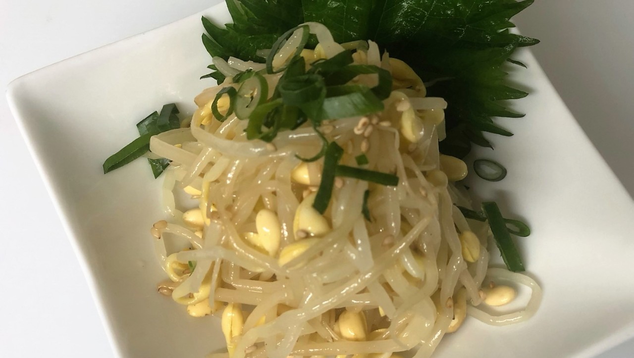 もやしを茹で、ごま油と塩などの調味料で味付けした料理。