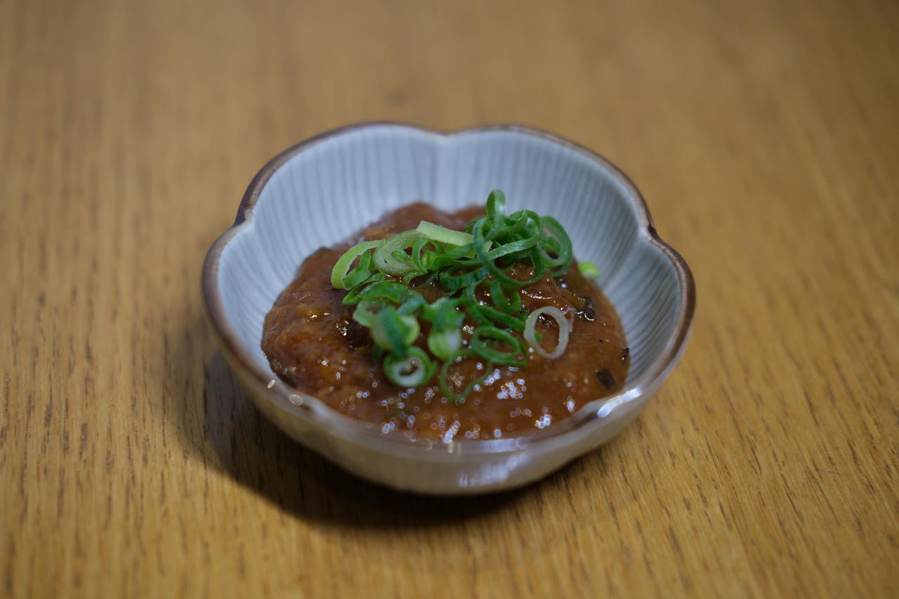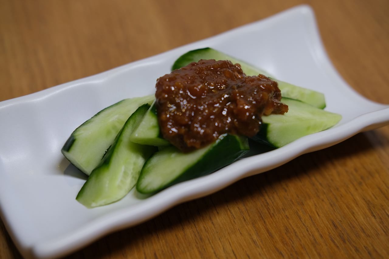 生のキュウリを切って、炒めた肉と味噌を混ぜたものをのせた料理。
