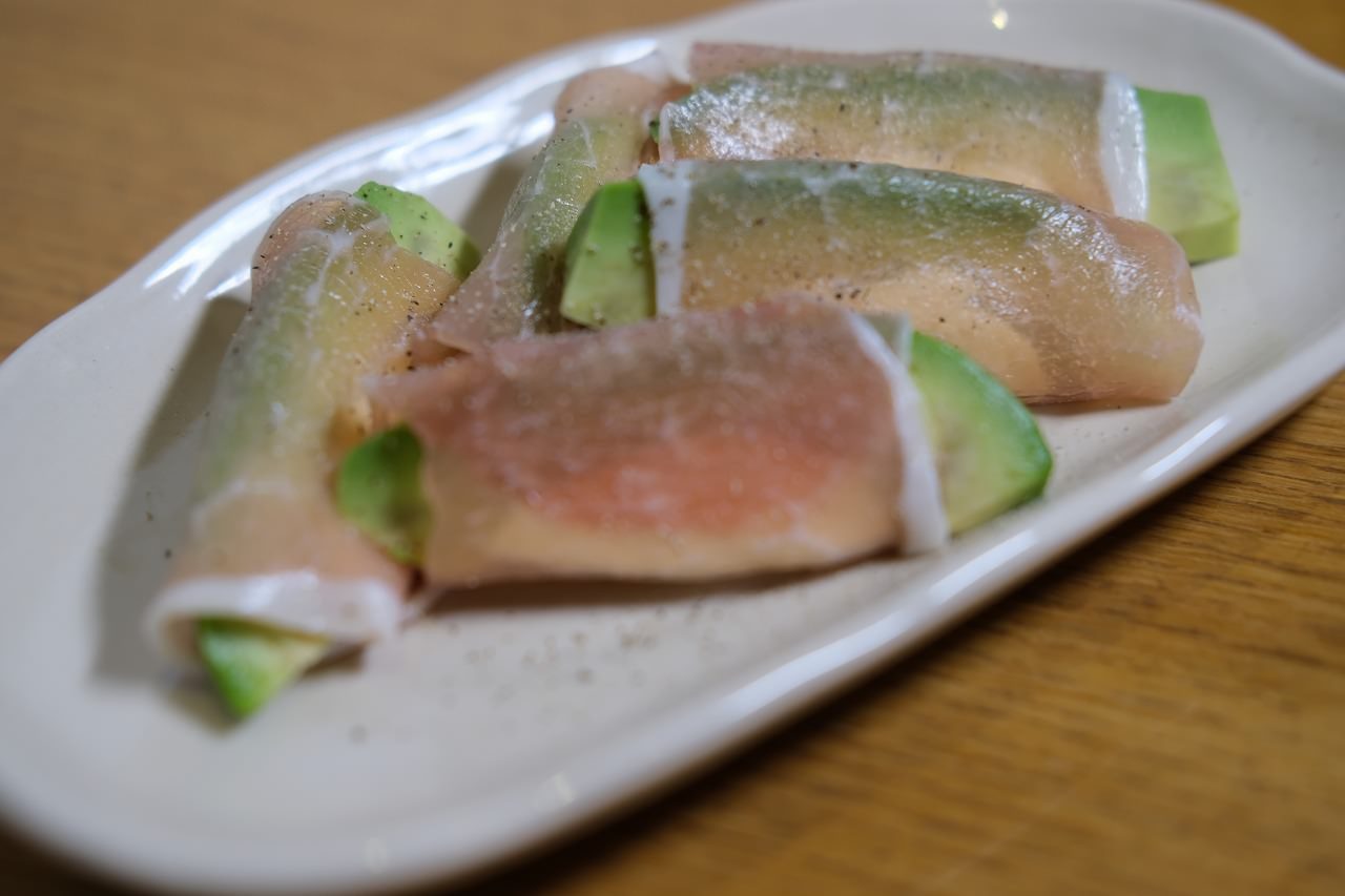 アボカドとクリームチーズを生ハムで巻いた料理。