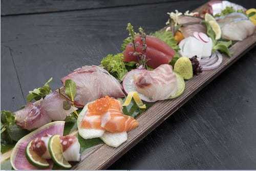 生のサーモンの身を薄く切り、醤油などで食べる料理。
