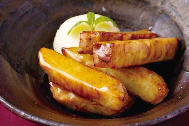 さつまいもを揚げて砂糖と水を煮詰めたタレと絡めた料理にアイスを添えたデザート。