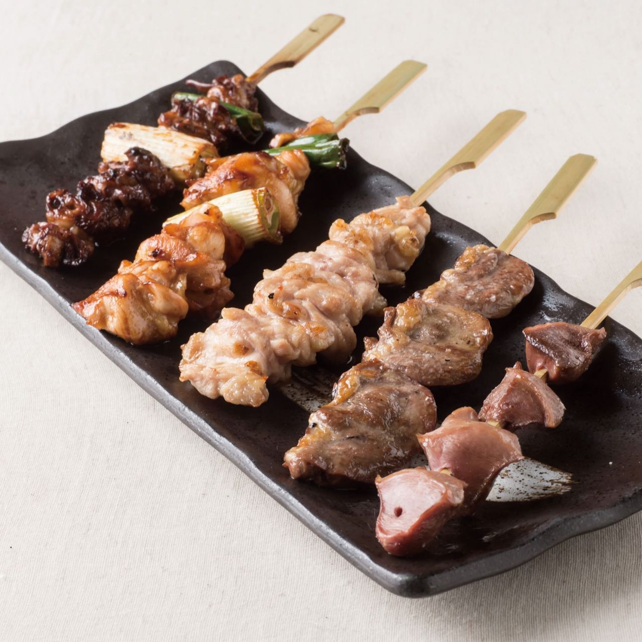 7種類の鶏肉の部位を串に刺して焼き、盛り合わせた料理。
