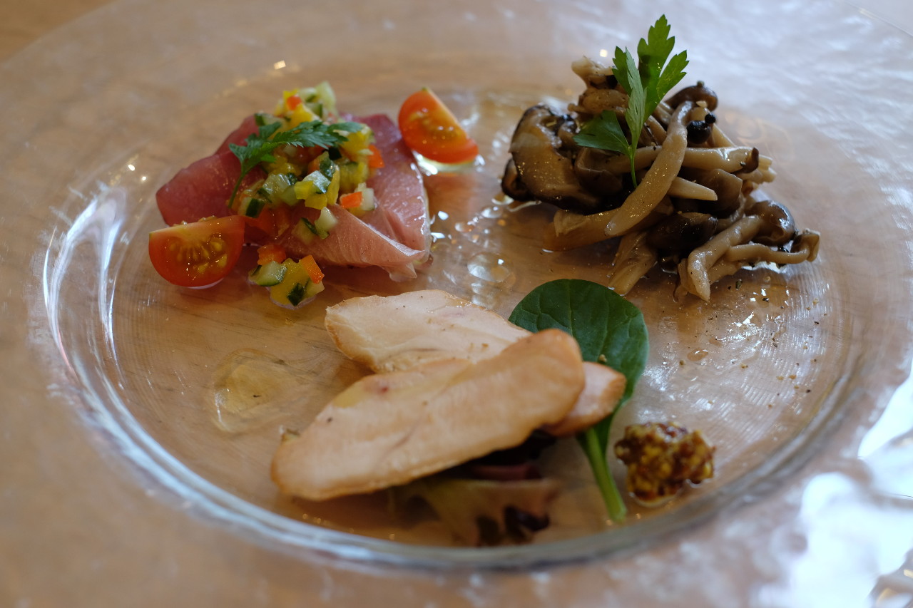 日によって種類が変わる、薄切りにした魚の切り身に、オリーブオイルや塩こしょうをかけた料理。