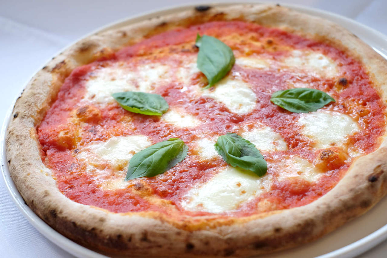 ピザ生地にトマトソースをぬり、チーズとバジルをのせて焼いた料理。