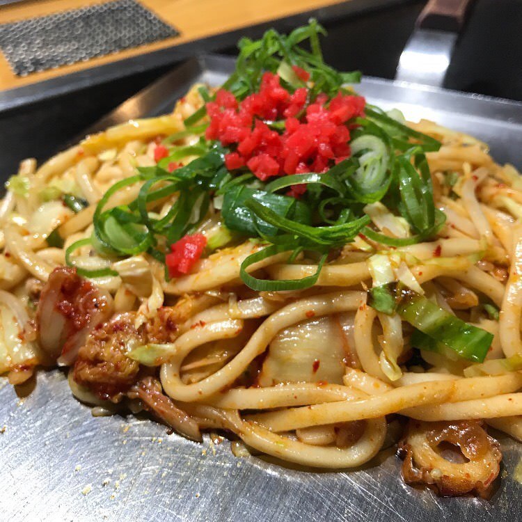 うどんと肉、野菜などの具を、辛味のある調味料で味付けして炒めた料理。