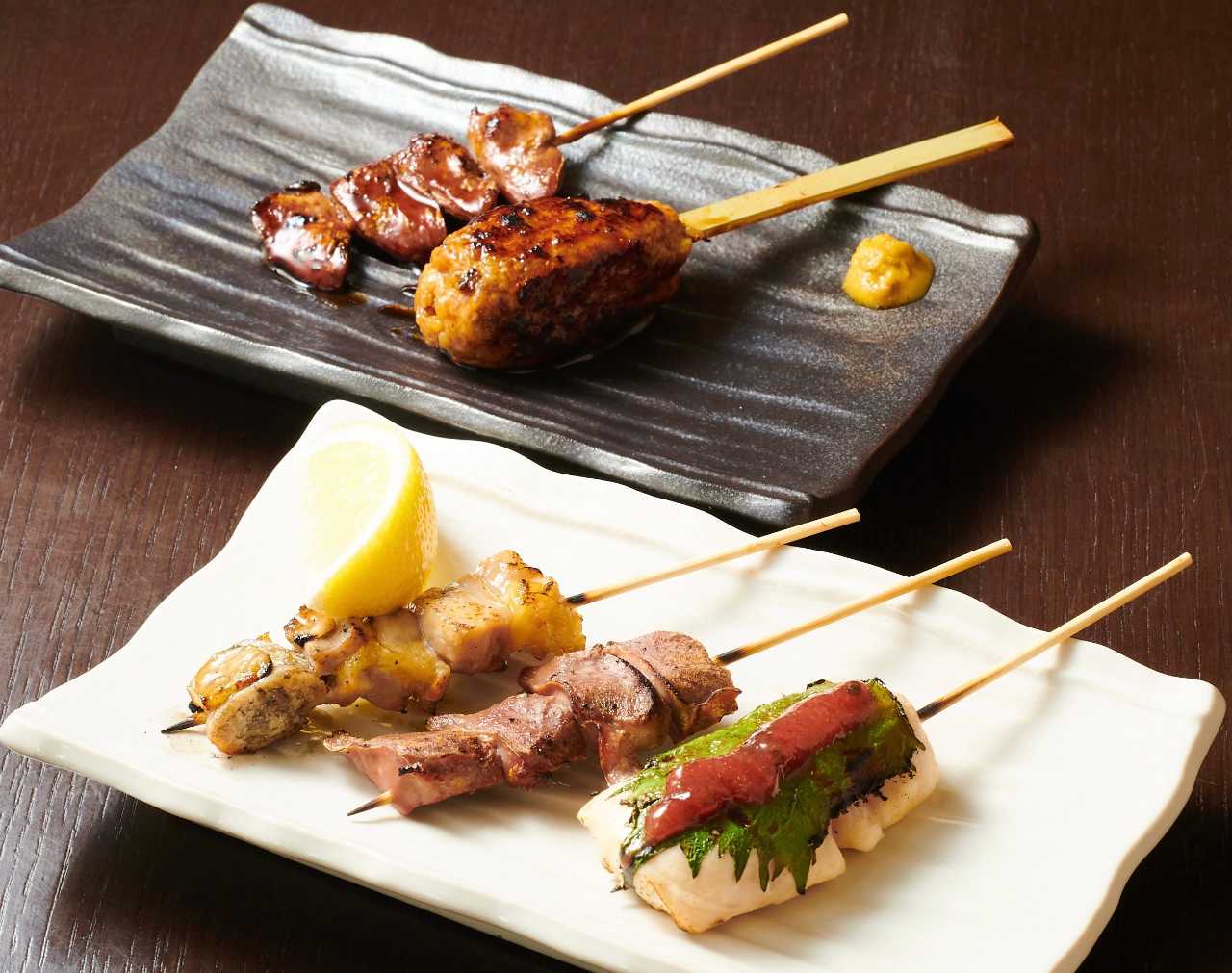 具材を串に刺し、パン粉をつけて油で揚げた5串を盛り付けた料理。