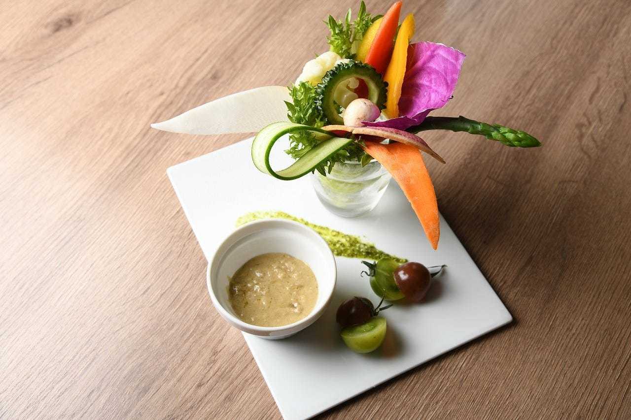 野菜などの食材とドレッシングを一緒に食べる料理。