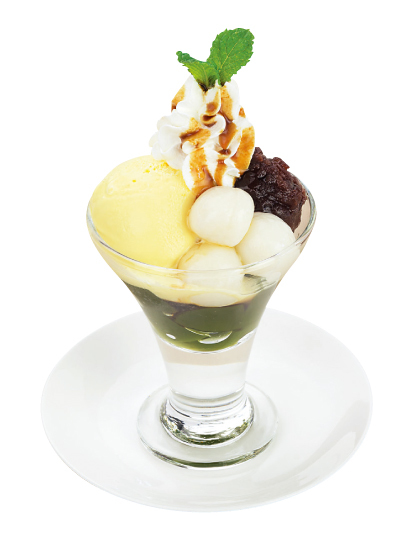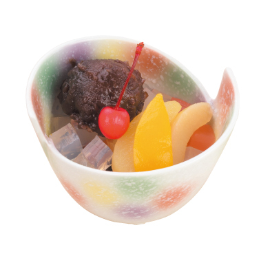 数種類のフルーツと寒天、みつ豆とあんこを器に盛り付け、黒蜜をかけて食べる料理。