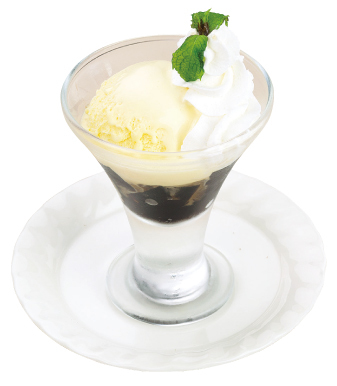 数種類のフルーツと寒天、あんこと生クリームを器に盛り付け、黒蜜をかけて食べる料理。