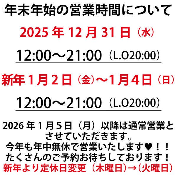 ●席だけの予約の場合 予約をキャンセル、変更(人数の減少やコースの取りやめなど)する場合は、以下のルールを適用させていただきます。 コース予約 当日キャンセル(連絡なし):100% 当日キャンセル(連絡あり):100% 前日キャンセル:25% 2日前キャンセル:10% 3日前キャンセル:0% |