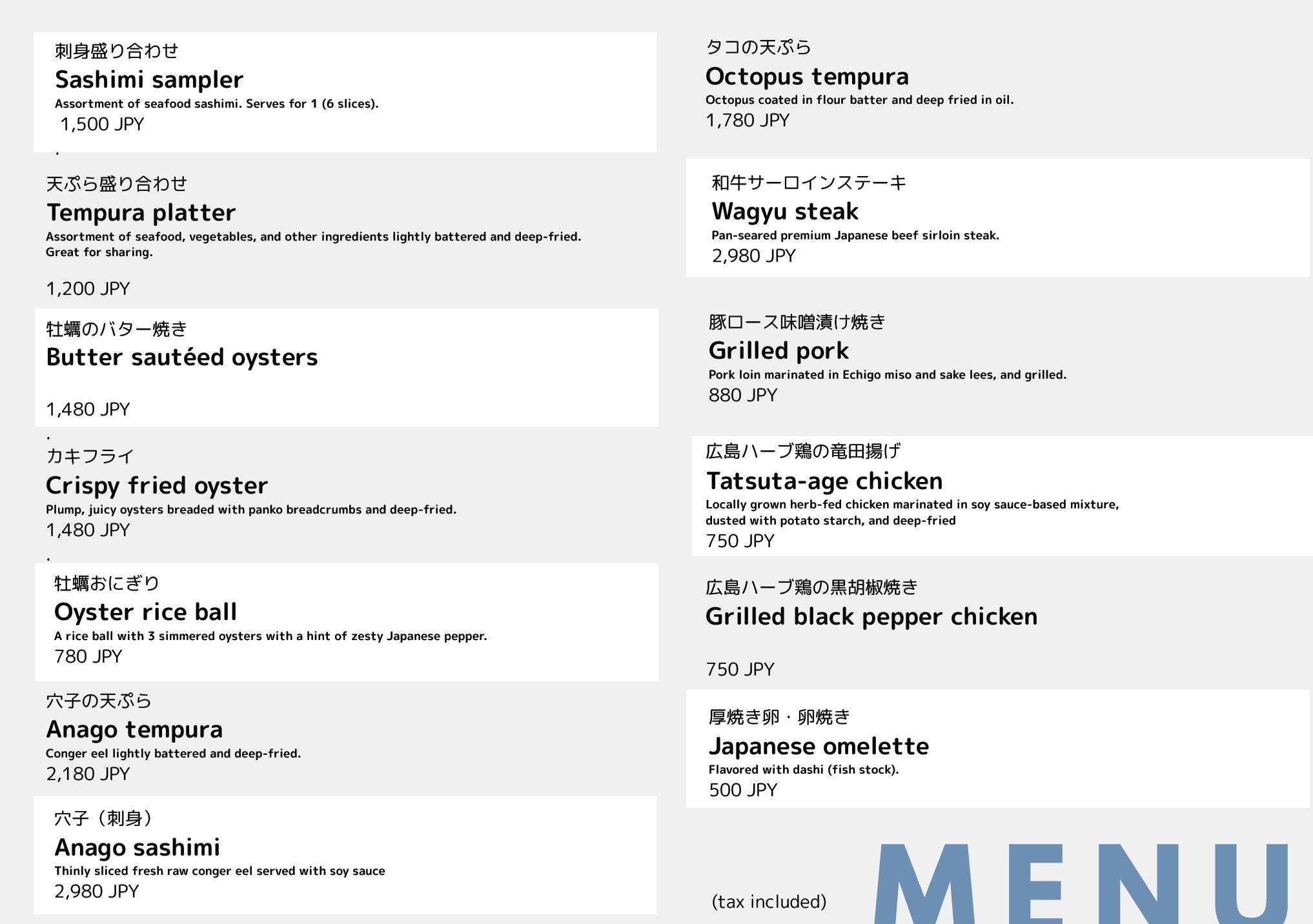 We have conger eel, oyster dishes, Hiroshima beef, Koune, Hiroshima local sake, national sake, and a wide variety of shochu.