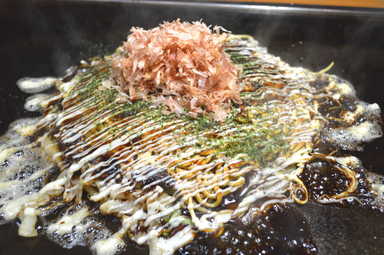 小麦粉生地と肉、野菜の具を混ぜずに重ねて焼くお好み焼き。