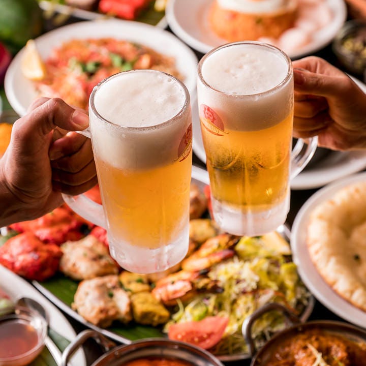 7종류 중에서 좋아하는 카레를 고를 수 있는 2시간 음료&주류 무한리필 코스가 3500엔부터. 난과 사프란 라이스는 무한리필 가능!
