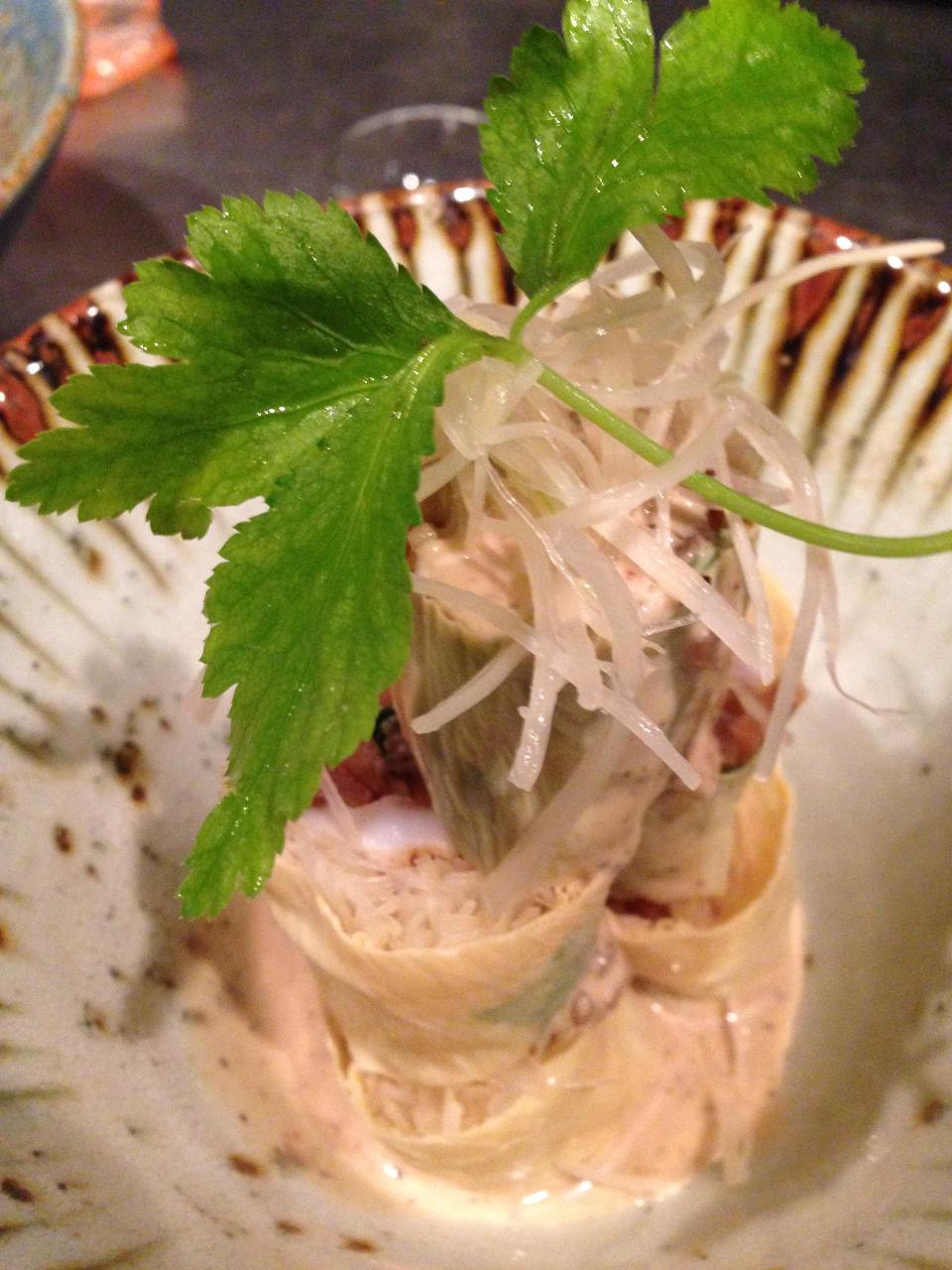 炙り帆立と蓮根きんぴらの湯葉巻き