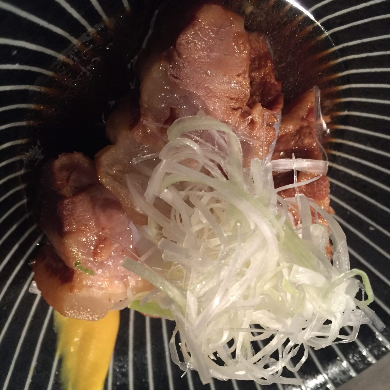 돼지 안심(삼겹살)을 조리용 채소와 함께 졸인 요리.