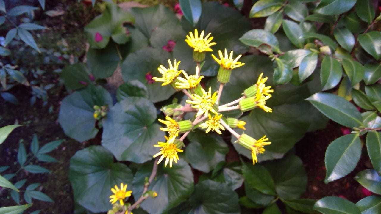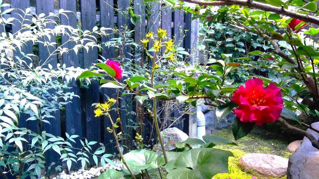 그늘에서 푸르게 잎을 키워온 츠와부키가 겨울이 되면 밝은 노란 꽃을 피웁니다.