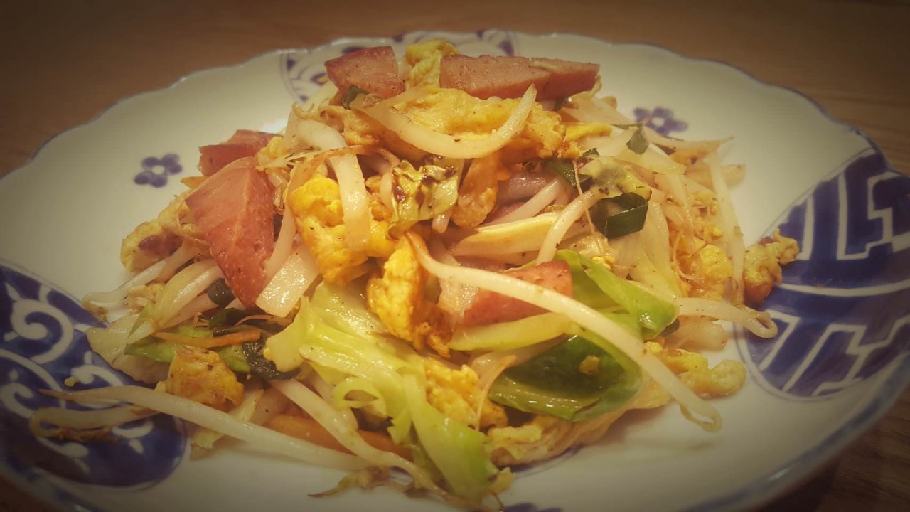 파스타에 볶은 양파와 피망을 섞고 케첩으로 맛을 낸 요리.