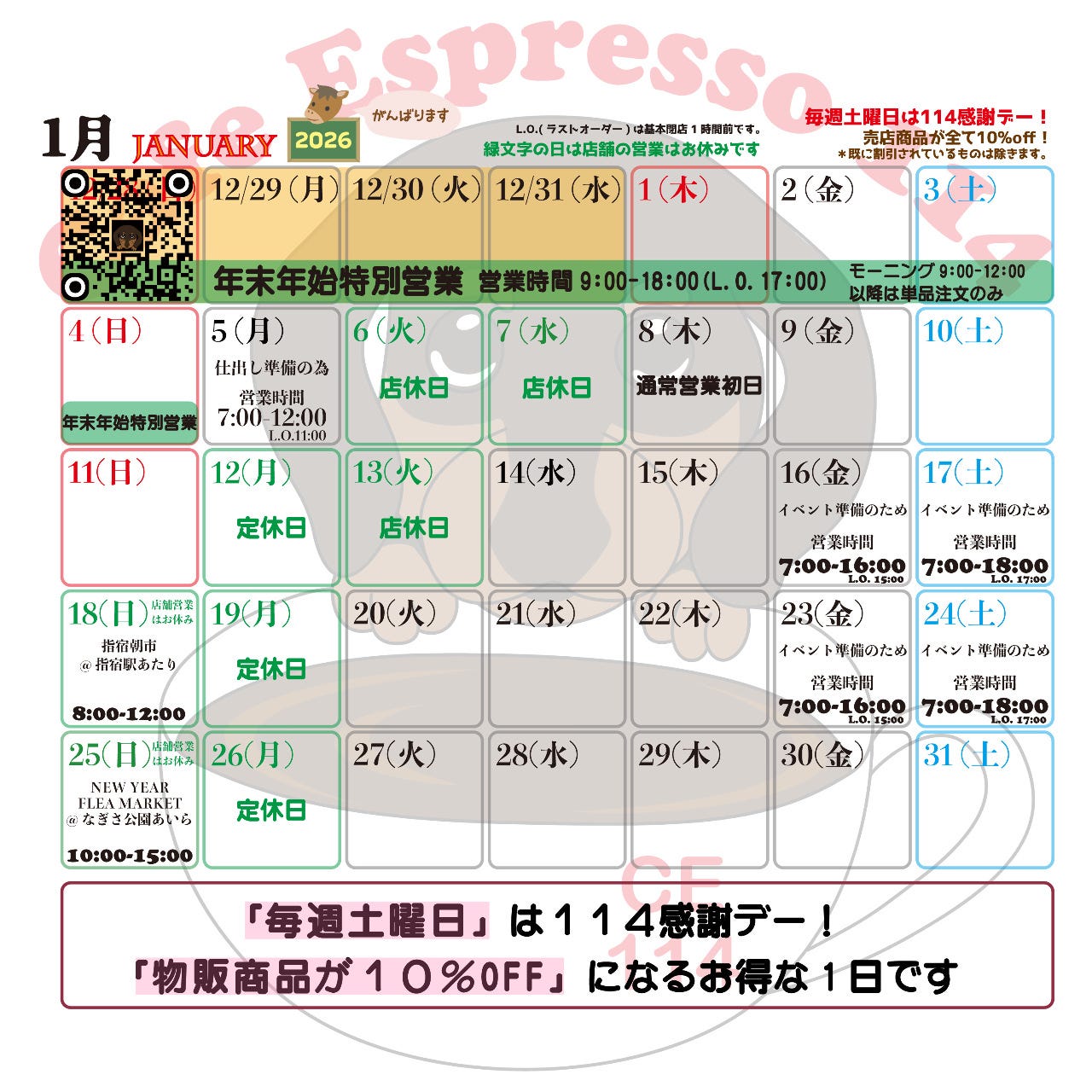 매주 월요일 연말연시(2026년 1월 6일~2026년 1월 7일) 연말연시(2026년 1월 12일~2026년 1월 13일) 기타(2026년 1월 18일・2026년 1월 25일) 기타(2026년 2월 2일~2026년 2월 3일) ※1월 3일은 쉬지 않고 영업합니다(영업 시간:9:00~18:00) ※1월 4일은 쉬지 않고 영업합니다(영업 시간:9:00~18:00) ※1월 5일은 쉬지 않고 영업합니다(영업 시간:7:00~12:00) ※1월 16일은 쉬지 않고 영업합니다(영업 시간:7:00~16:00) ※1월 17일은 쉬지 않고 영업합니다(영업 시간:7:00~18:00) ※1월 20일은 쉬지 않고 영업합니다(영업 시간:7:00~16:00) ※1월 21일은 쉬지 않고 영업합니다(영업 시간:9:00~18:00) ※1월 23일은 쉬지 않고 영업합니다(영업 시간:7:00~16:00) ※1월 24일은 쉬지 않고 영업합니다(영업 시간:7:00~18:00)