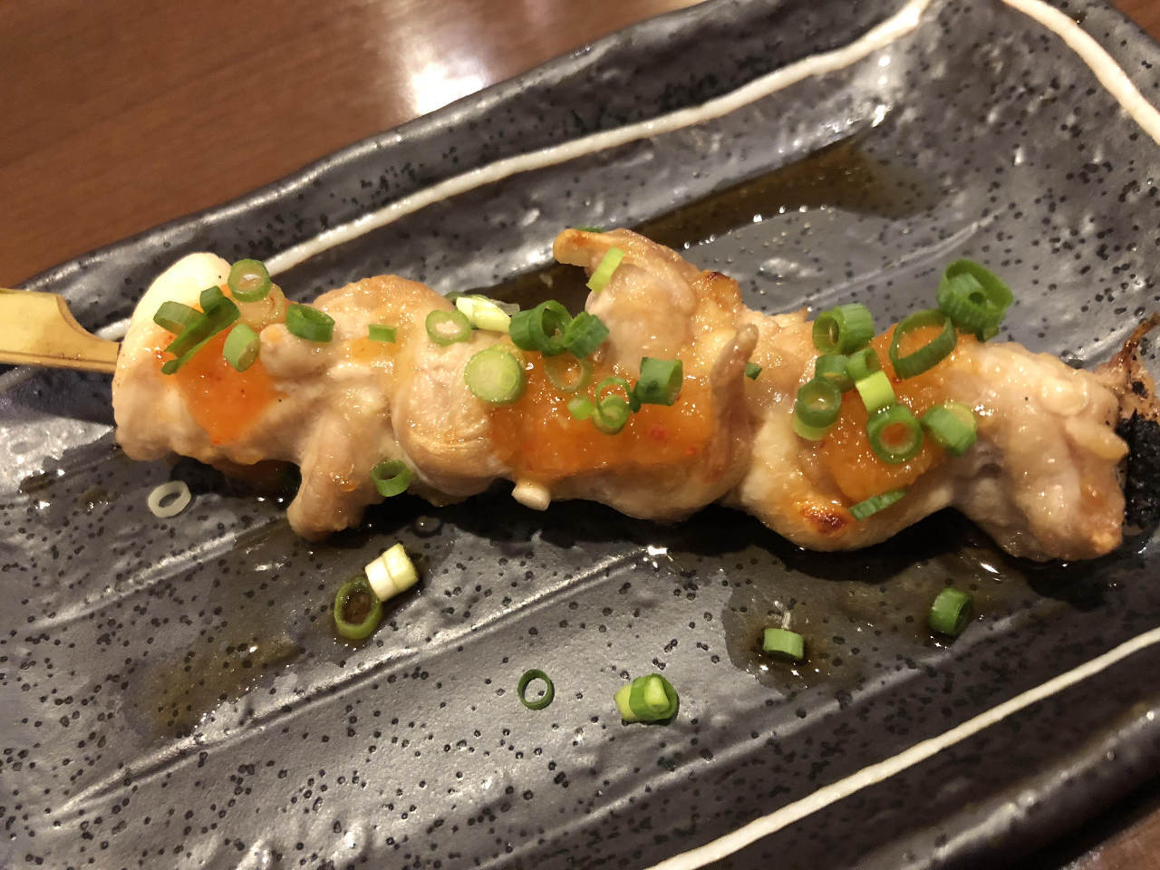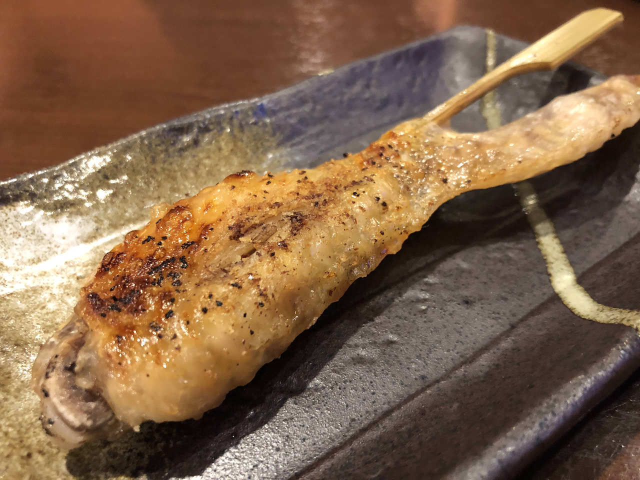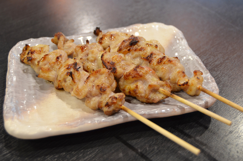 스나즈리라고 불리는 닭 위 부분의 껍질을 꼬치에 꿰어 직화로 구운 요리.